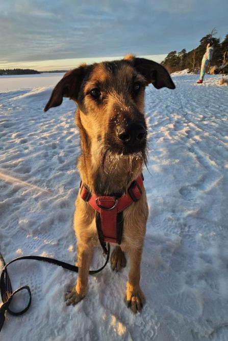 Sisäsiisteys on hyvällä mallilla ja muutaman tunnin yksinolot koirakaverin kanssa ovat sujuneet rauhallisesti. Valjaiden pukeminen sujuu hyvin. Jella on myös päässyt mukaan metsäretkelle, joka oli mieluinen ja rohkaiseva kokemus.