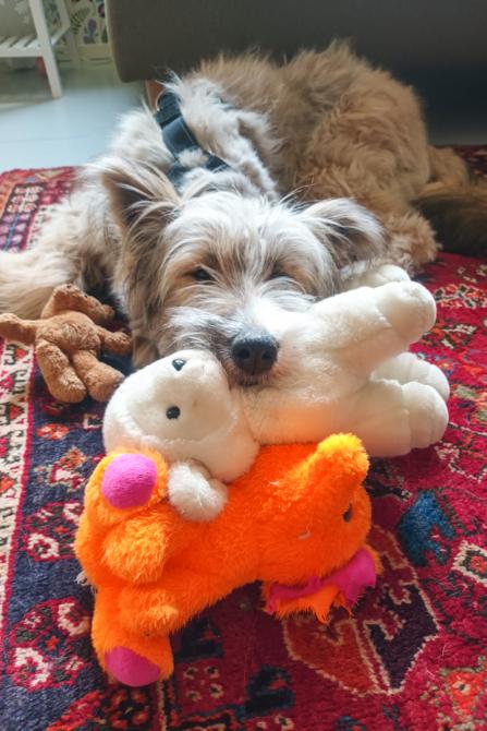 Viikkojen aikana tutussa ja turvallisessa ympäristössä arasta takkuturkista onkin paljastunut iloinen ja leikkisä nuorukainen, joka selvästi nauttii elämästä. Kuisma rakastaa tuttujen ihmisten rapsutuksia, hakeutuu itse siliteltäväksi ja iloitsee kotiintulijoista haukahduksella.