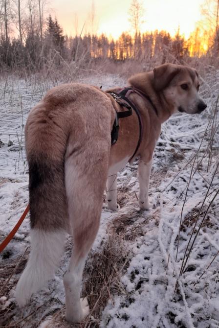 Lenkkeily on noussut Laran suosikkipuuhaksi. Vaikka alkuun ulkoilu jännitti, nykyään metsälenkit saavat aikaan iloisia hypähdyksiä valjaiden nähdessä. Lara kävelee nätisti hihnassa. Lenkit tehdään aina kodin koirakaverin kanssa, välillä mukana on jopa talouden kaikki neljä koiraa.
