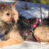Elena puki Neddille varusteet ja kantoi pojan mukanaan tarhan ulkopuolelle kuvattavaksi aiemmin tässä kuussa. Kyseessä oli Neddin ensimmäinen ulkoilukerta. Aivan kuin eri puolilta kehoa puristavissa epämukavissa naruissa ei olisi ollut riittävästi pureksittavaa, kiristyneestä talutinhihnasta syntyvä paineen tunne sai aikaan muutaman paniikinpoikasen (joista selvittiin, kiitos jarrupalan!). Matka itsessään oli melko lyhyt, ja Neddi taittoi sen pääasiassa omin tassuin tuumaustaukojen kera. Metsätiellä se malttoi istua ja nuuhkia ilmaa sekä ympäristöä, mutta reissu oli sen verran jännittävä, etteivät Elenan namit uponneet. Seuraavia ulkoiluharjoituksia toivomme Neddin jatkavan omassa kodissa reippaan koirakaverin tukemana.