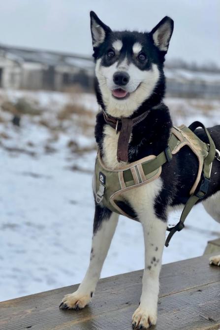 Pandakarhun värinen siro Penni-tyttö haluaisi kovasti ulos pienestä aitauksesta. Nuori, huskytyyppinen koira on aivan onnessaan päästessään juoksentelemaan lähiympäristöä tutkimaan eikä hihnakävely tuota ongelmia.