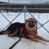 Rosalie on päässyt kuitenkin harjoittelemaan hihnalenkkeilyä, ja sen mielestä olikin suorastaan ratkiriemukasta päästä hyppelehtimään lumihankeen ja välillä heittäytymään sinne kieriskelemään! Välissä sitten saattoikin poukkoilla hihnaa pitelevän ihmisen siliteltäväksi, ja ihmisrakkaalle tytölle se taisikin olla lenkin kohokohta: edes pienen hetken sai pitää ihmisen ihan vain omanaan. Lenkin lopuksi Rosalie kohtasi joukon tarhalla asuvia koiria, ja se tervehti niitä kaikkia ystävällisesti ja rauhallisesti.
