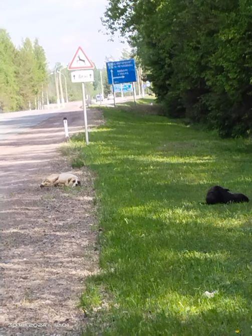 Vaalimaalta Viipuriin vievän maantien varrelta löydettiin kesällä kaksi läkähdyksissä olevaa koiraa. Kovin turvallista paikkaa koirat eivät olleet valinneet nokosilleen ja oli onni, ettei kukaan ollut vahingossa tai ihan silkkaa ilkeyttään ajanut niiden yli. Paikalla saapui Elenan ystävä, joka auttoi koirat autoon ja vei ne suorinta tietä Viipuriin Aurika-klinikalle.