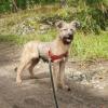 Tina on päässyt harjoittelemaan hihnakävelyä jonkin verran ja tutun koirakaverin kanssa rauhallisessa metsikössä se suhtautuu ympäristöön rennosti ja uteliaasti uusia hajuja tutkiskellen. Autotien vierellä kävely jännittää.